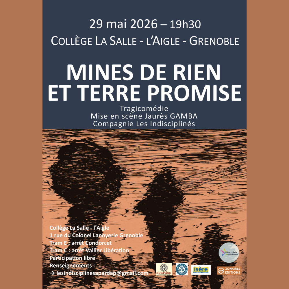 Les Indisciplinés sont heureux de vous inviter à la prochaine représentation de “Mines de rien et Terre promise”, suivie d’un échange avec les comédiens qui se tiendra le 29 mai à 19h30 au collège de l’Aigle, 1 rue du Colonel Lanoyerie, Métro E /Condorcet. La participation est libre, au chapeau. Il est préférable de s’inscrire par mail. lesindisciplinesapardap@gmail.com